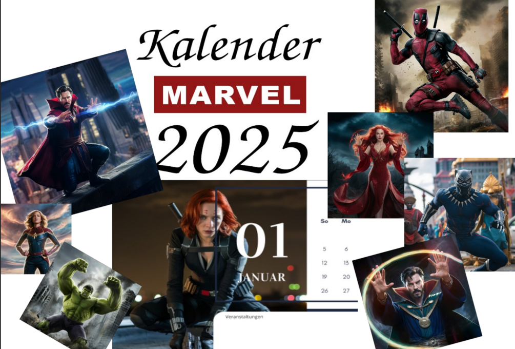 Wand- und Tischkalender, Marvel, sie sind druckbar, die Bilder werden von einer KI generiert, deshalb sind die Charaktere anders als die echten, bekannten.